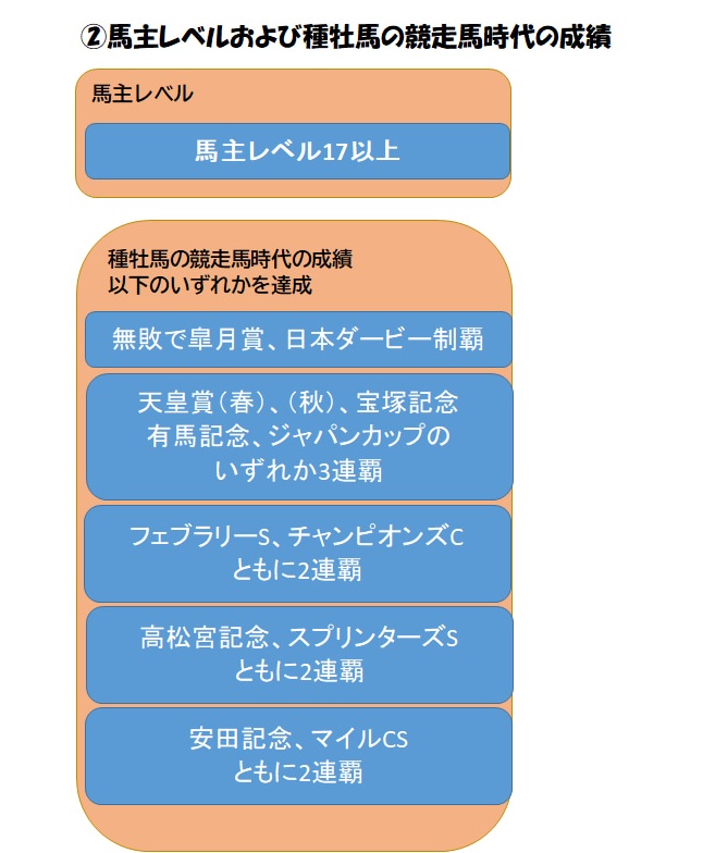 私見ですが、この産駒条件を満たすためには、やや晩成、晩成型の種牡馬では種牡馬引退が15歳と考えると公開できるころには引退している可能性が大きいです。