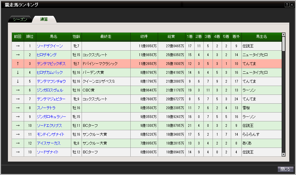 競争馬ランキング(通算)も3位にも駆け上がり、1位ソードザクイーン号の背中が見えてきました