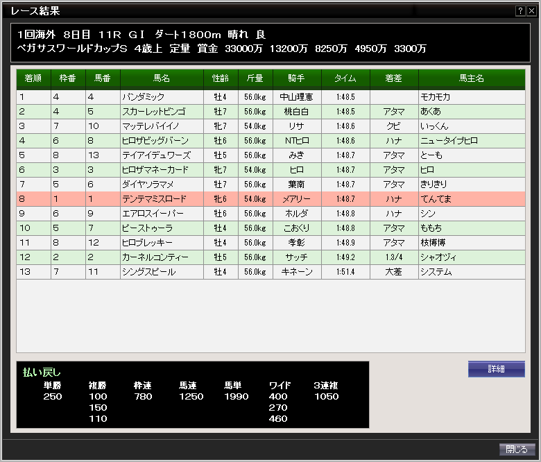 そして、昨日連覇を目指して、ペガサスワールドカップステークスに出走したミスロード号は、全く良いとなく惨敗。